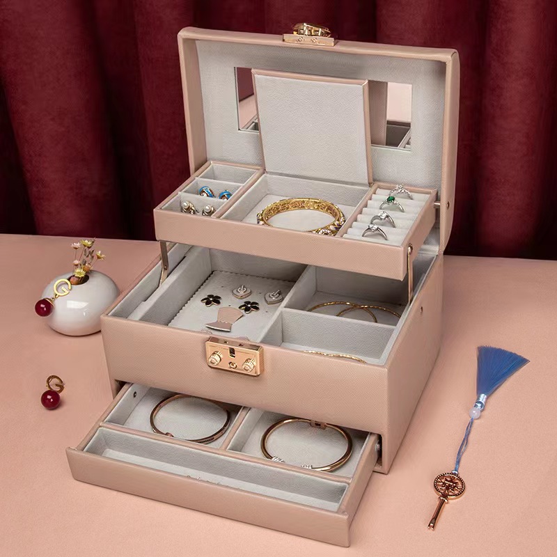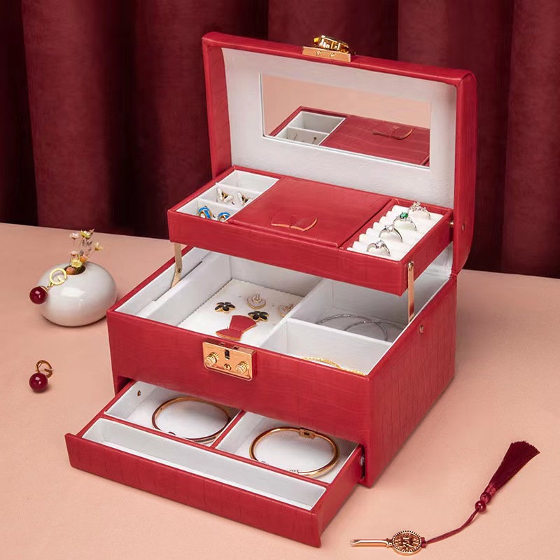 Regal Elegance Handcrafted Leather Jewelry BoxImmerse yourself in the timeless allure of our handcrafted leather jewelry box, a masterpiece of regal elegance and craftsmanship.Every detail has been meticulously designed to exude luxury, from the plush velvet interior to the intricate leatherwo